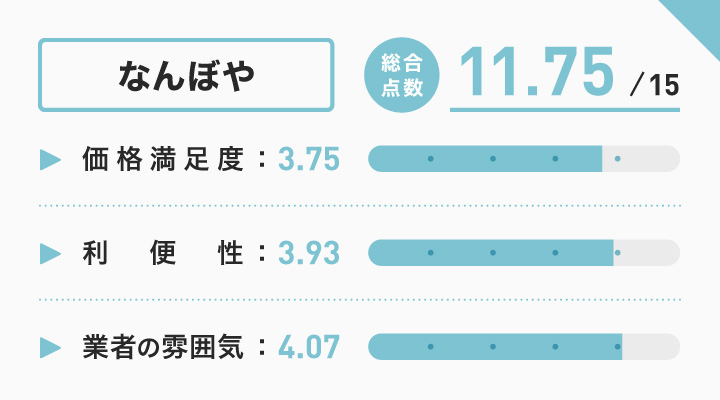 | 業者名 | 満足だった | 少し満足だった | 普通 | 少し不満 | 不満だった | 平均点 |